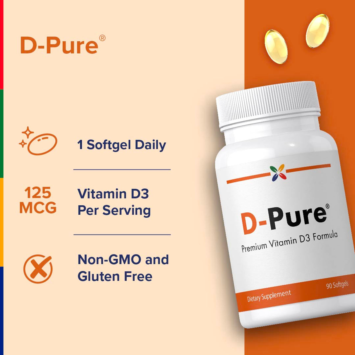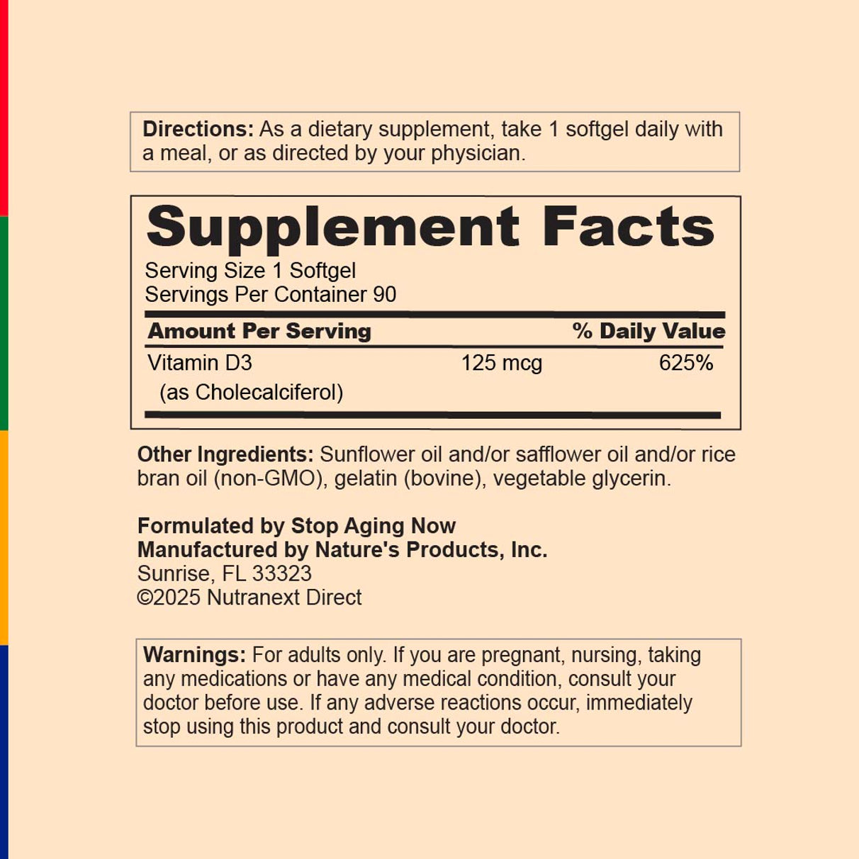 | Vitamin D3 (as cholecalciferol) (5000 IU) | 125 mcg | 625% |