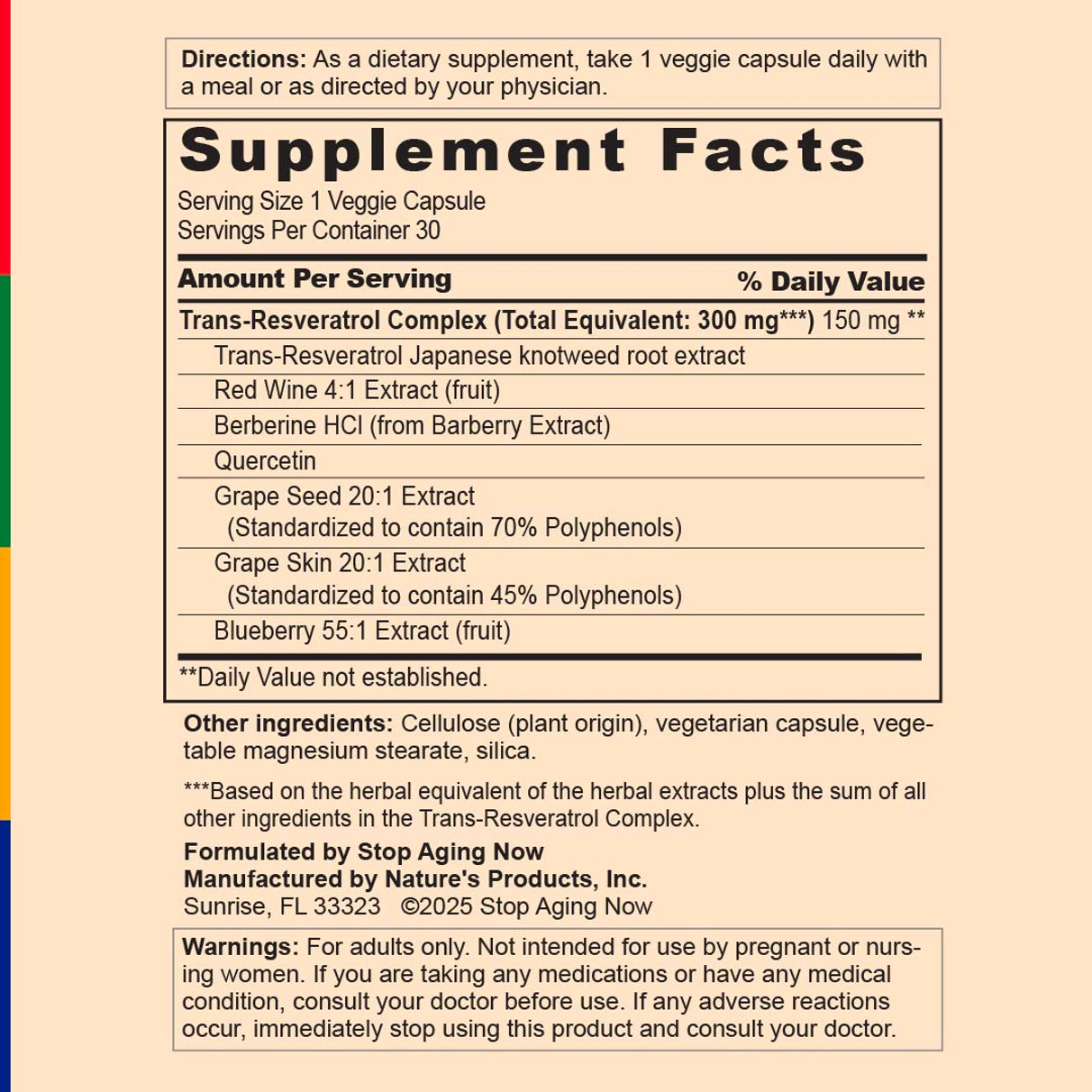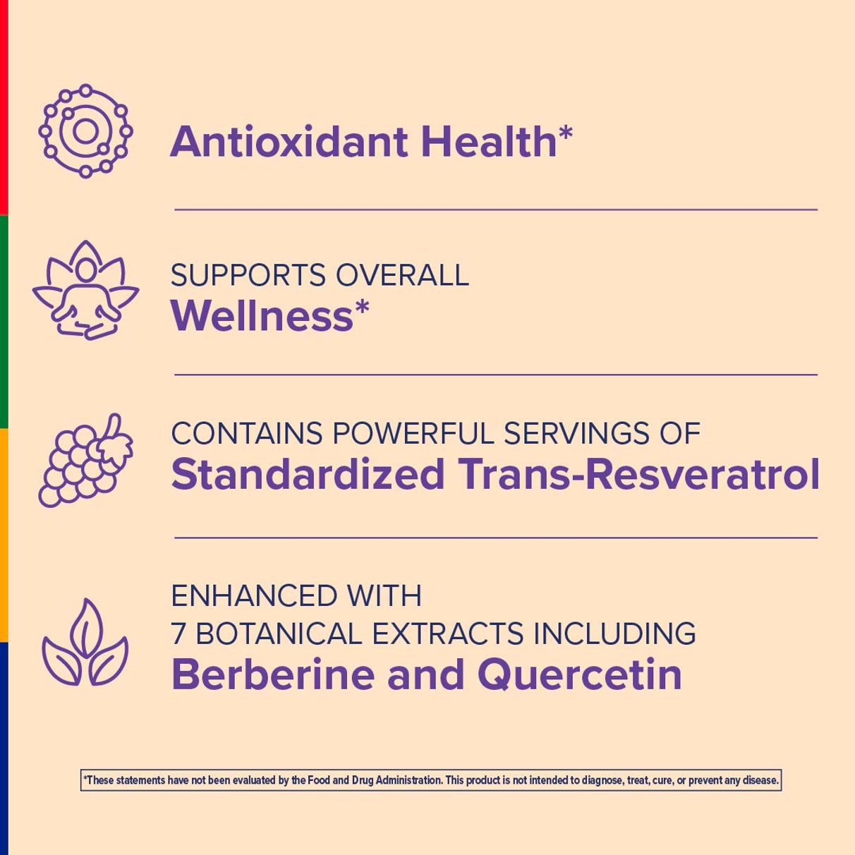 Complexo de Trans-Resveratrol (Equivalente Total: 300 mg) Extrato de raiz de Knotweed japonês de Trans-Resveratrol Extrato de Vinho Tinto 4:1 (Vitis vinifera) (fruta) Berberina HCl (do Extrato de Barberry) Quercetina Extrato de Semente de Uva 20:1 (Vitis vinifera) (Padronizado para conter 70% de Polifenóis) Extrato de Mirtilo 55:1 (Vaccinium spp.) (fruta) | 150 mg | *** |