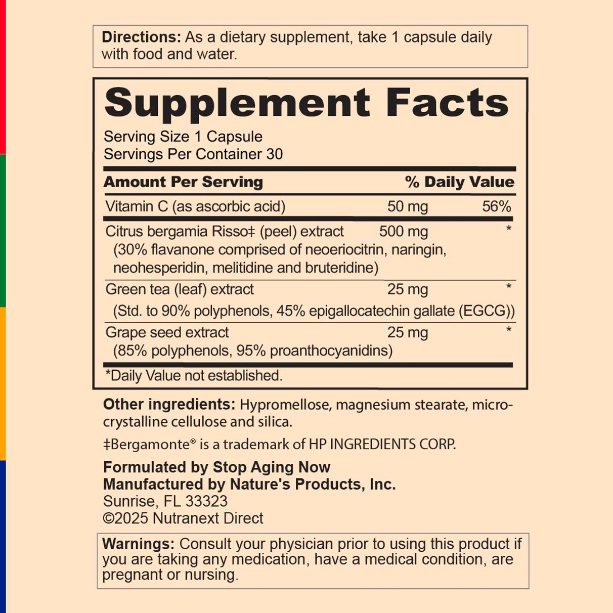 Extrato Polifenólico de Citrus Bergamia Risso‡ (da casca, 30% flavanona composto por neoeriocitrina, naringina, neoeriocitrine, melitidina e brutetidina) | 500 mg | * |